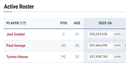 本场比赛,掘金队多达8名球员缺阵。球员中薪资最高的是纳吉布的818万。这9名球员的工资合计约为2600万美元,还不到恩比德本赛季工资的一半。这位伟人的年薪为5522万美元。